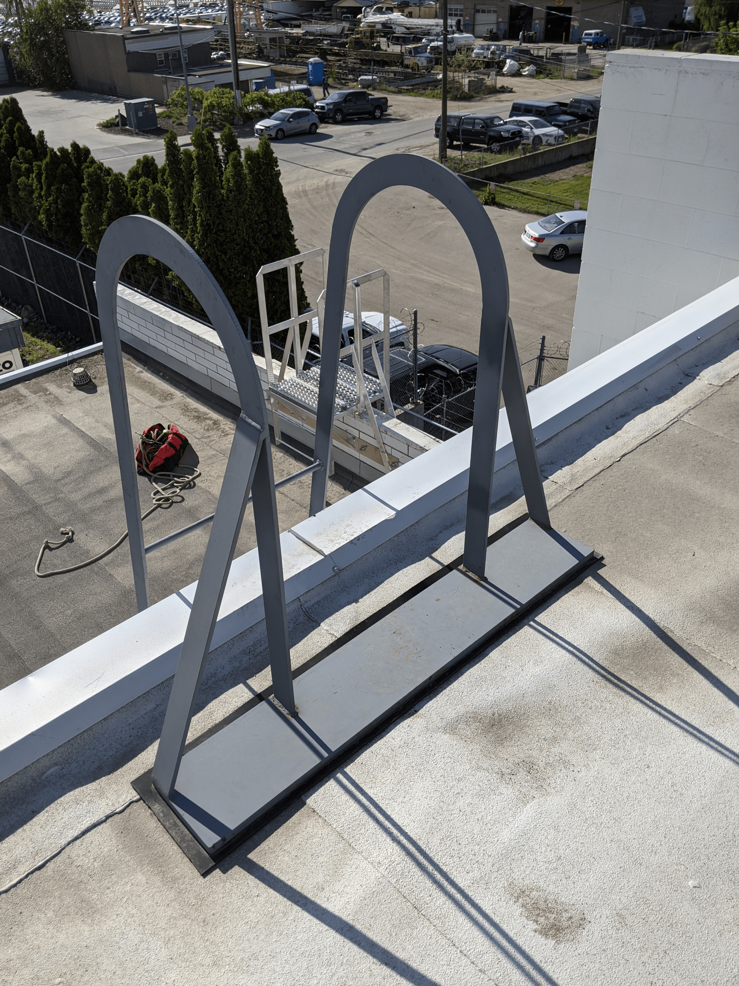 Design and installation of approximately 26′ of climbing ladders, one of aluminum and one of steel. The aluminum ladder is on the exterior of the building allowing access from ground level, therefore it features a security gate to prevent unauthorized access. The steel ladder has a slightly forward-leaning angle for climbing to avoid obstructions surrounding the ladder, the slight angle also allows for a more comfortable climb. The project also features guardrail adjacent to the ladders to allow safe hoisting of supplies and raised warning lines to ensure workers do not leave the prescribed work zones.