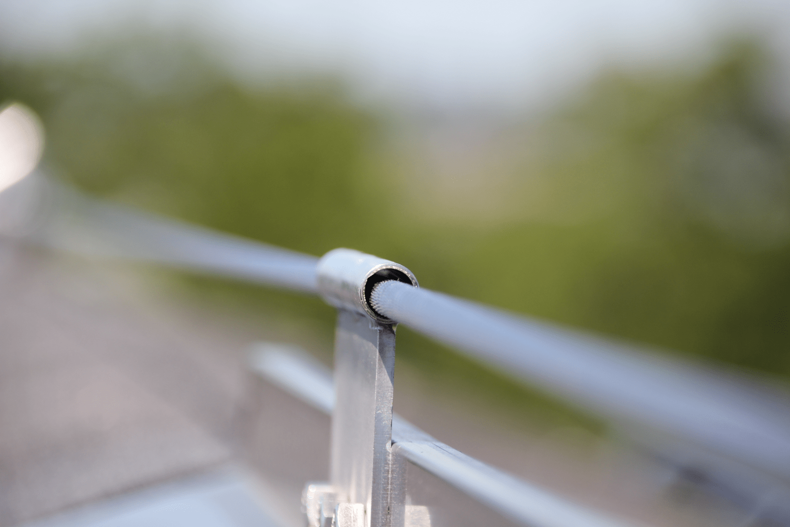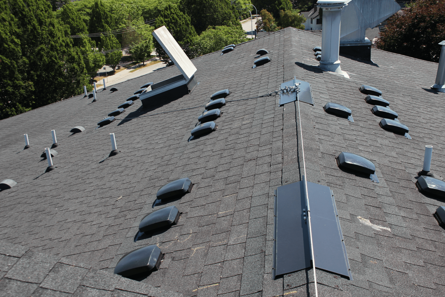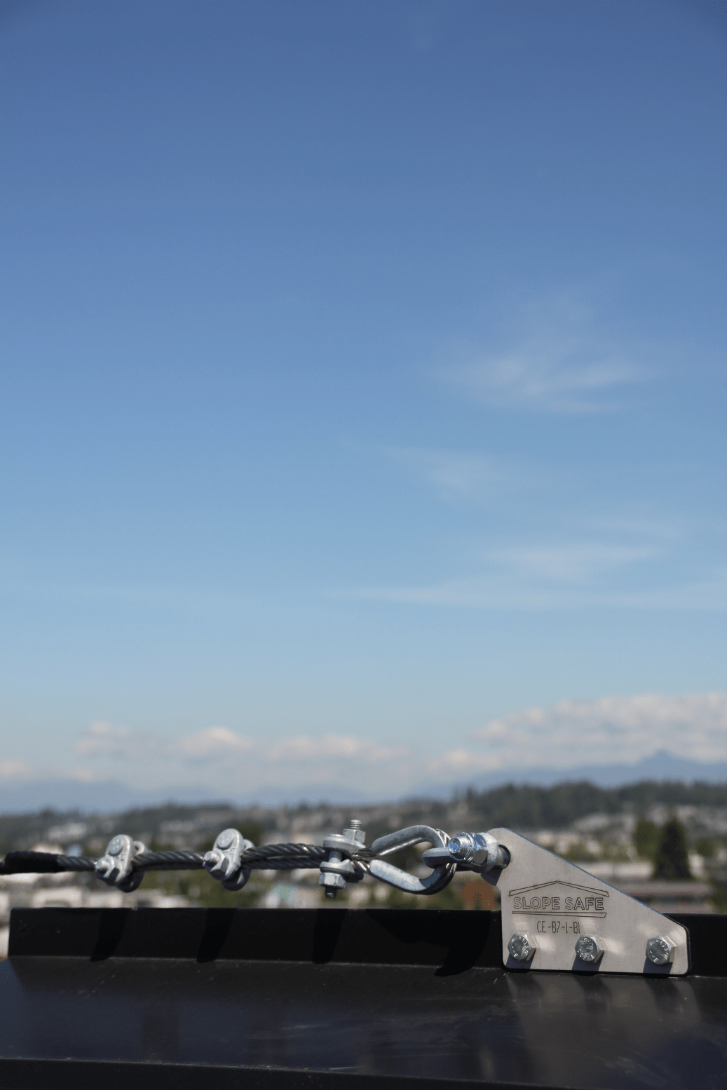 A modular setup of Slope Safe™ anchors is used for a horizontal lifeline (HLL) to run along the peak of the building to provide continuous fall protection coverage. To provide 100% worker protection a permanent vertical lifeline (VLL) cable runs to the hatch to protect workers as they transit from the hatch to the HLL. In this installation of Slope Safe™ the structural sheet was installed underneath the shingles, allowing for the ability to re-roof without removing the attachment to the structure. The black integrated flashing provides a clean look and acts as the initial defense against water penetration.